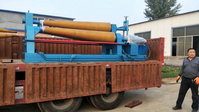 該機結(jié)構(gòu)型式為三輥對稱式,上輥在兩下輥 對稱位置作垂直升降運動,通過絲桿絲母蝸桿傳動而獲得,兩下輥作旋轉(zhuǎn)運動,通過減速機的輸出齒輪與下輥齒輪嚙合,為卷制板材提供扭矩。上輥可分離取料電動升降起輥??砂惭b靠輪卷制錐體、角鐵、槽鋼等異異型鋼材。