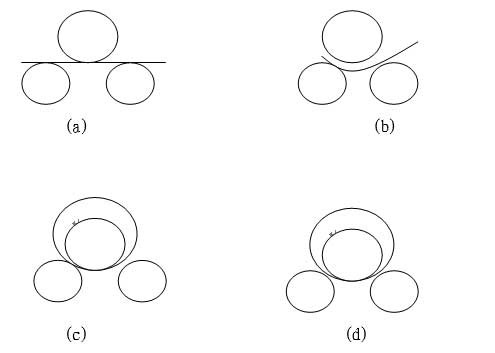 該機結(jié)構(gòu)形式為三輥對稱式。上輥在兩下輥中間對稱位置作垂直升降運動,通過蝸輪、蝸桿而獲得,兩下輥作旋轉(zhuǎn)運動,通過減速機的輸出齒輪與下輥齒輪嚙合,實現(xiàn)板材的行走。當上輥的下壓力超過材料的屈服限度時,便使所卷制的材料變形,變形過程如下圖: